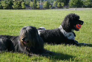 We've been having fun starting with Saturday when we got to go for a long walk by the lake. We even got to go into the water. Well, Woobie went in without much coaxing. I needed someone to throw a stick and once I got the stick out of the water, I just wanted to chew on it. Not Woobie. She got in the water, swam around, and then sat on the shore looking wet and happy.